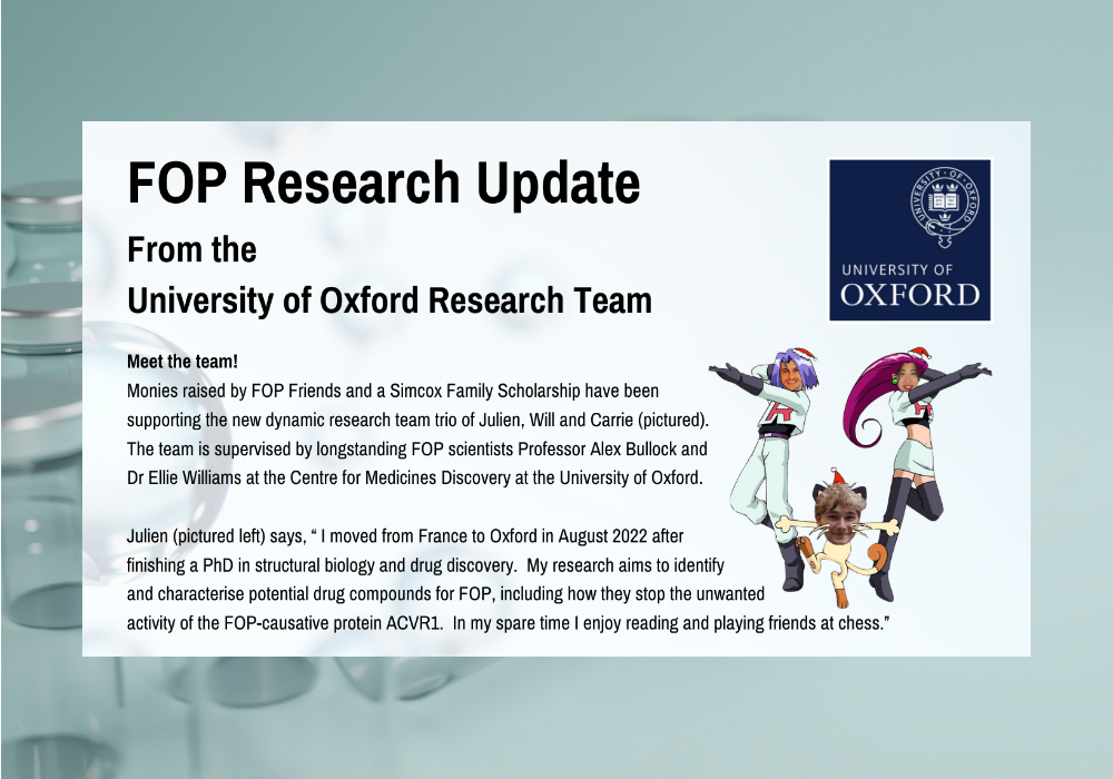 The team at the University of Oxford is led by Professor Alex Bullock. The team is currently renewing itself as the current members move on to new roles. While Dr Ellie Williams has moved to a new department, she continues to have a passionate interest in FOP and is always around to answer our questions!